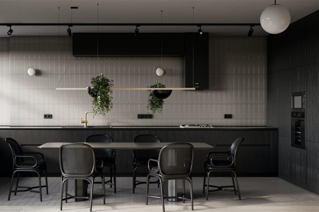 A restricted palette of warm greys, ash blacks, and soft taupes keeps the focus on form and material. Bespoke cabinetry and seating zones are seamlessly integrated into the architecture. The kitchen and dining merge into one unified volume, enhancing flow and spatial clarity. Every wall and opening is deliberately aligned—framing perspectives with intention, not accident.