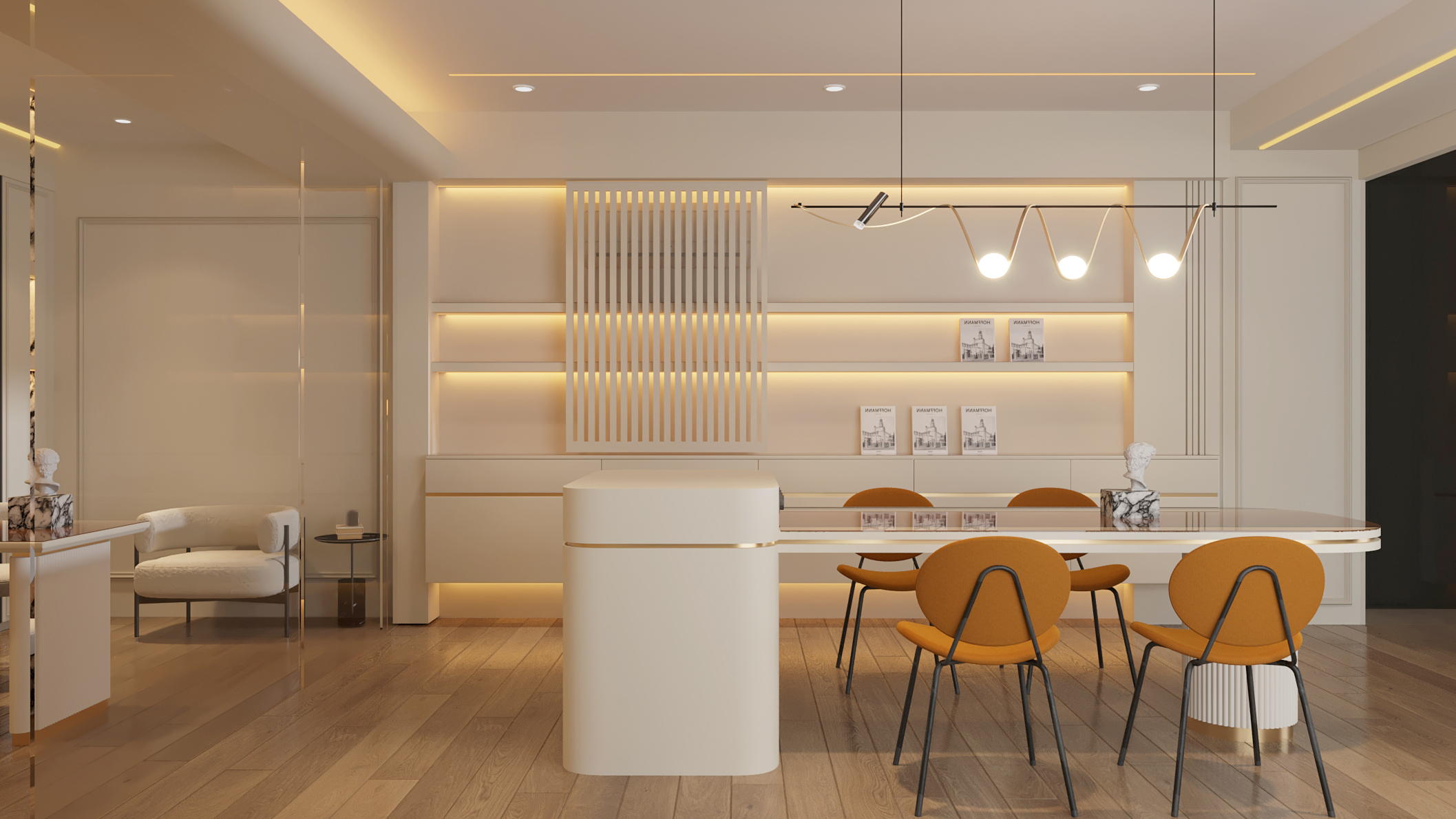 Modern elegance meets tailored hospitality. The interior features rich textures such as veined marble, soft gold accents, and curated wall shelving to showcase form and function. Sculptural lighting and curated decor elements reinforce a sense of prestige and exclusivity. Designed as a luxurious consultation and workspace zone, this space welcomes clients with a blend of trust, sophistication, and an understated wow factor.