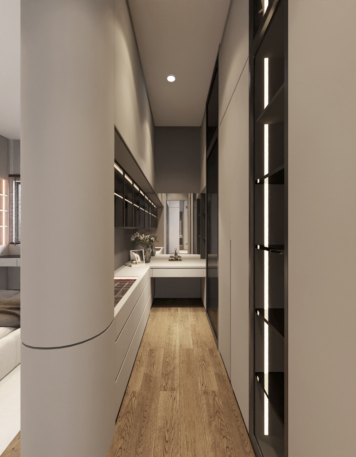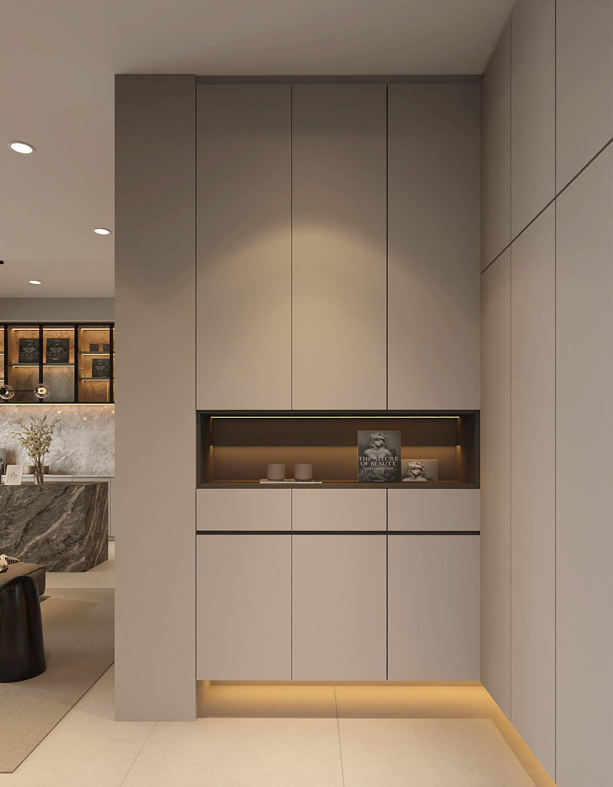 Neutral tones, warm lighting, and clean-lined furniture create a timeless ambiance. The dry kitchen features a statement marble island and softly illuminated open shelves, offering both utility and charm. The living area incorporates built-in storage with display niches and ambient lighting, while the full-height windows bring in generous daylight without compromising privacy.