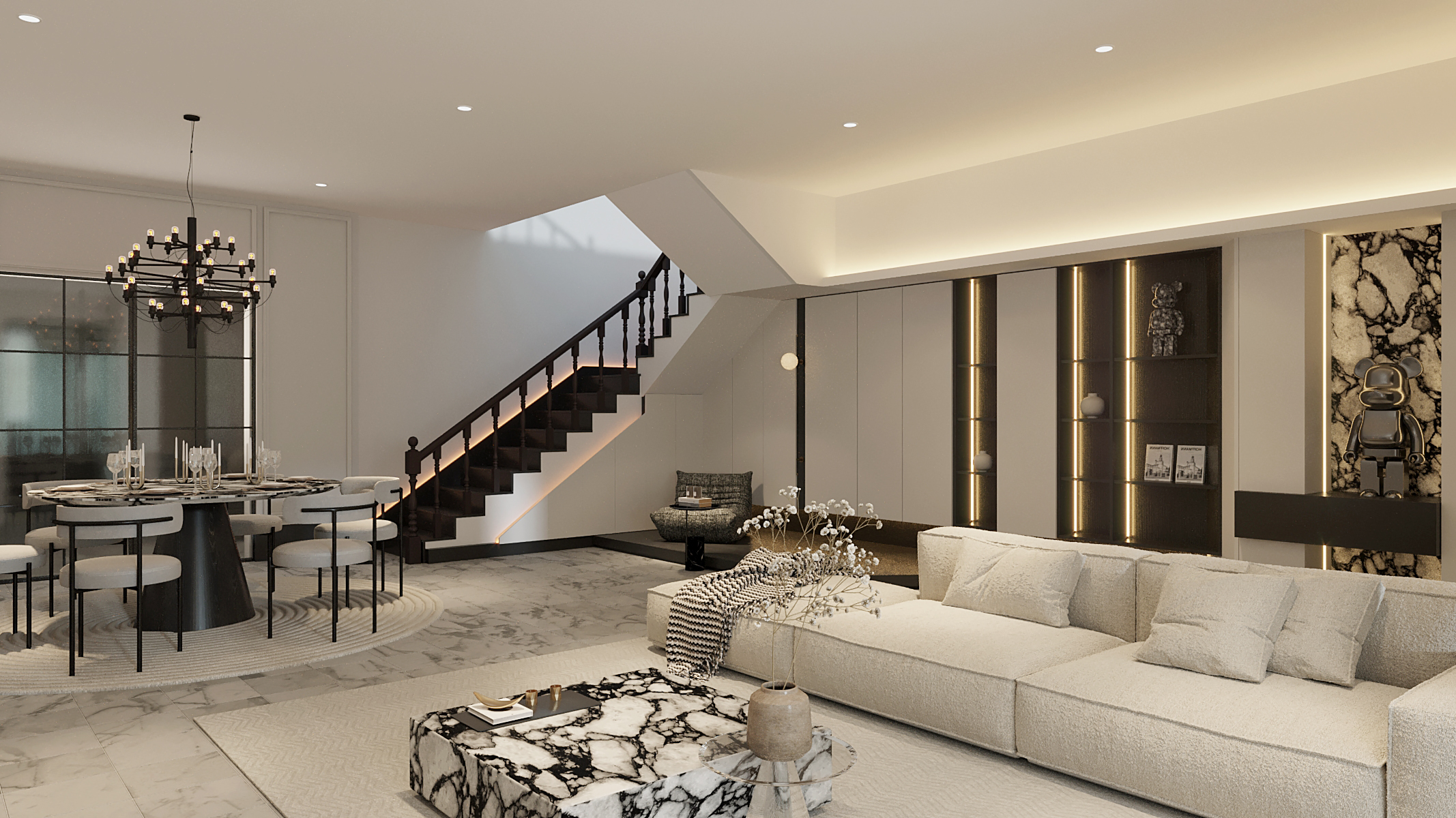 Bold black accents slice through soft cream backdrops, creating strong visual rhythm. Fluted marble, linear lighting, and panel molding bring in layers of sophistication, while carefully curated furniture offers comfort without compromising aesthetic integrity. The design flows effortlessly from façade to living zone — a consistent narrative of elegance.