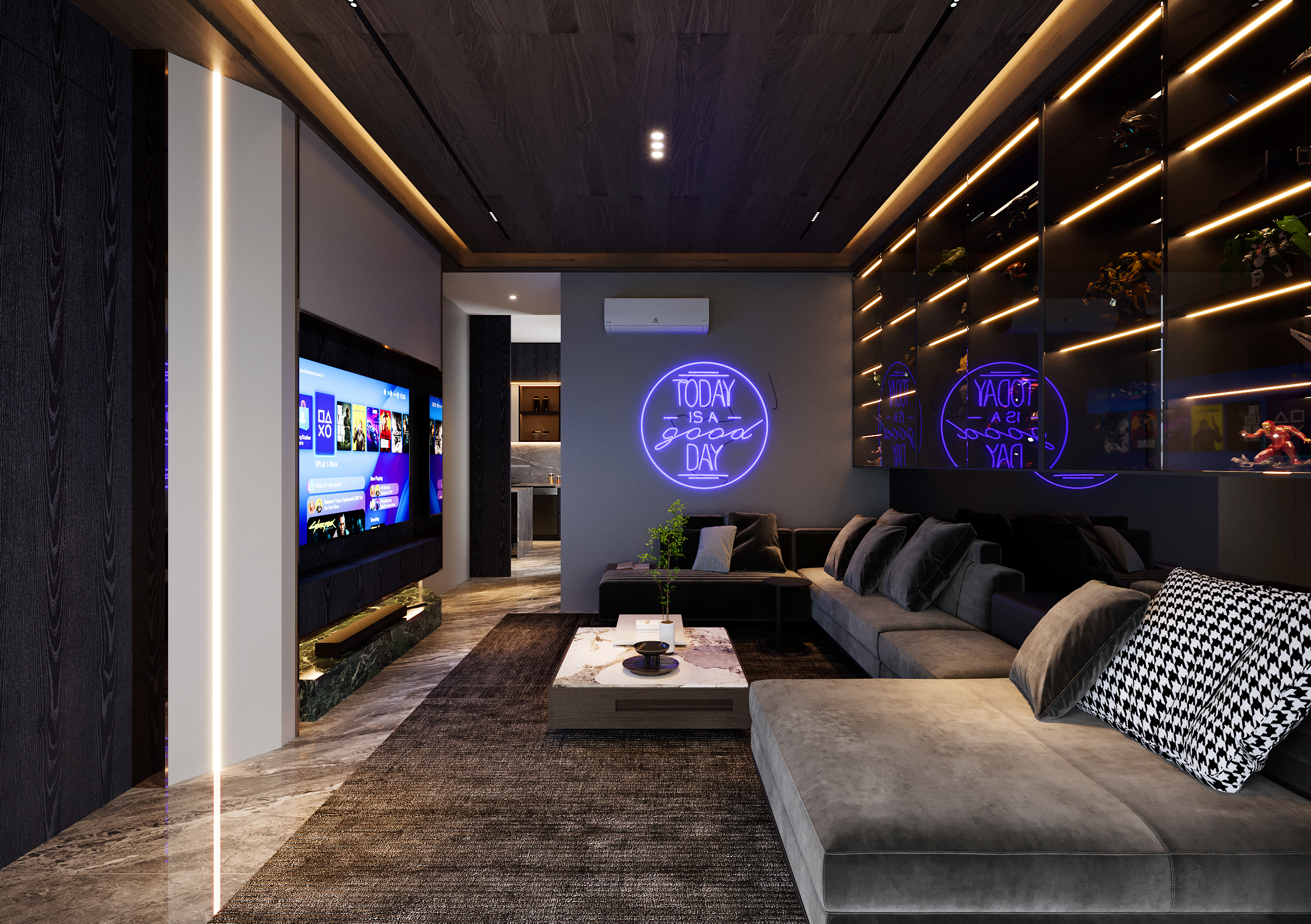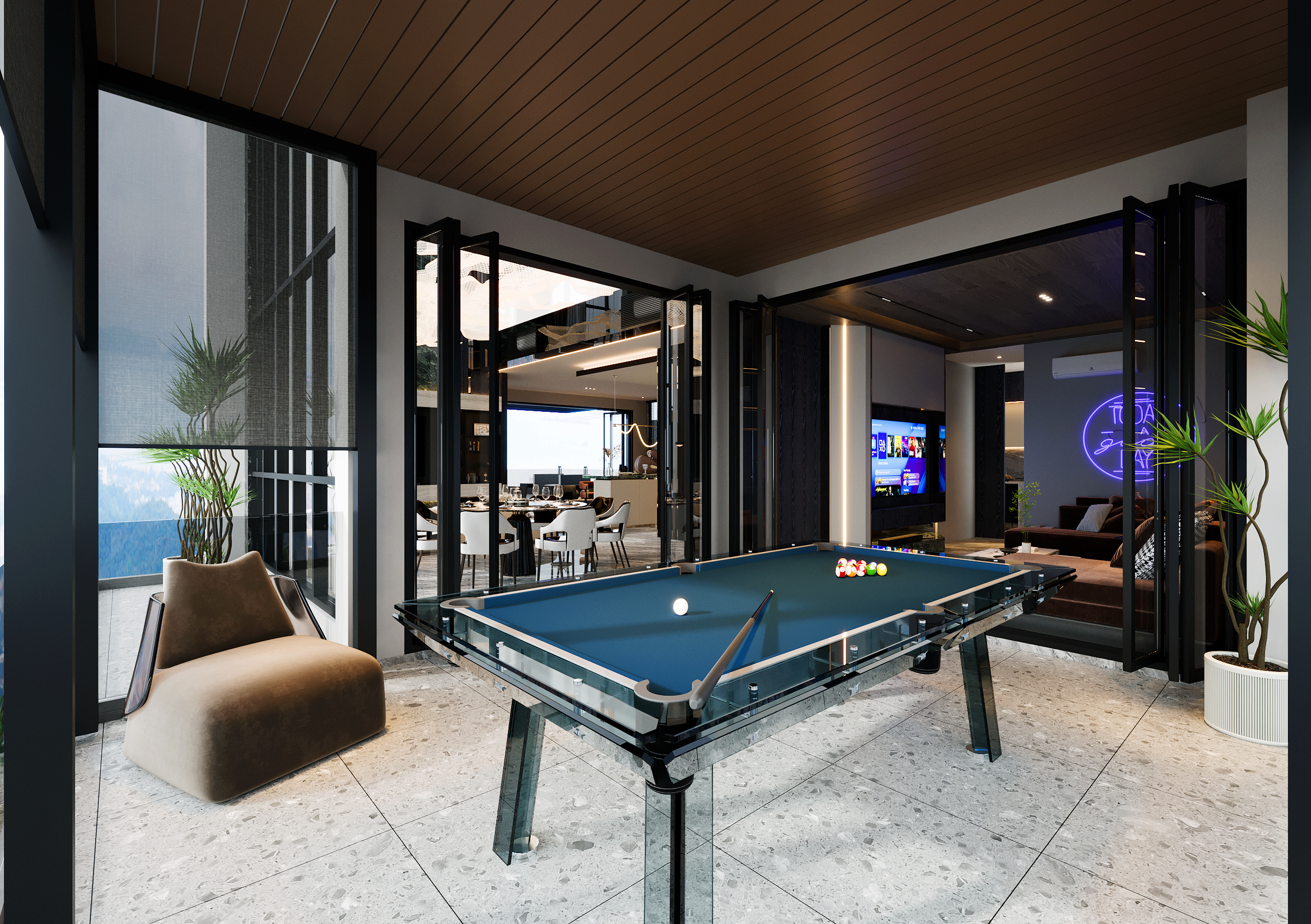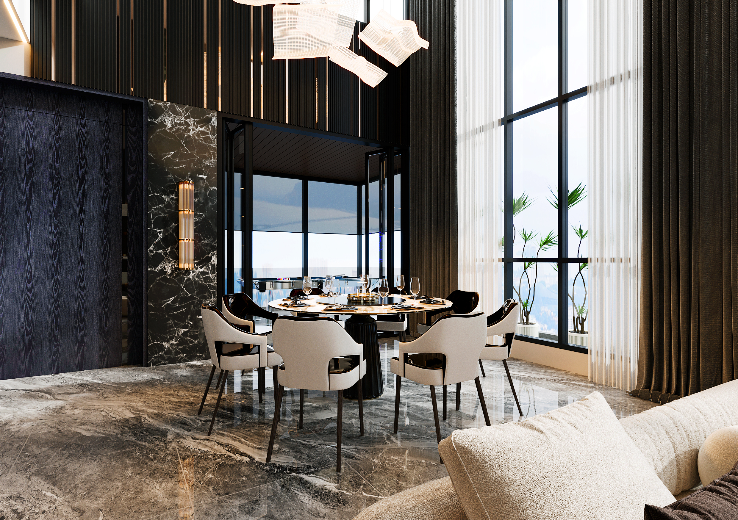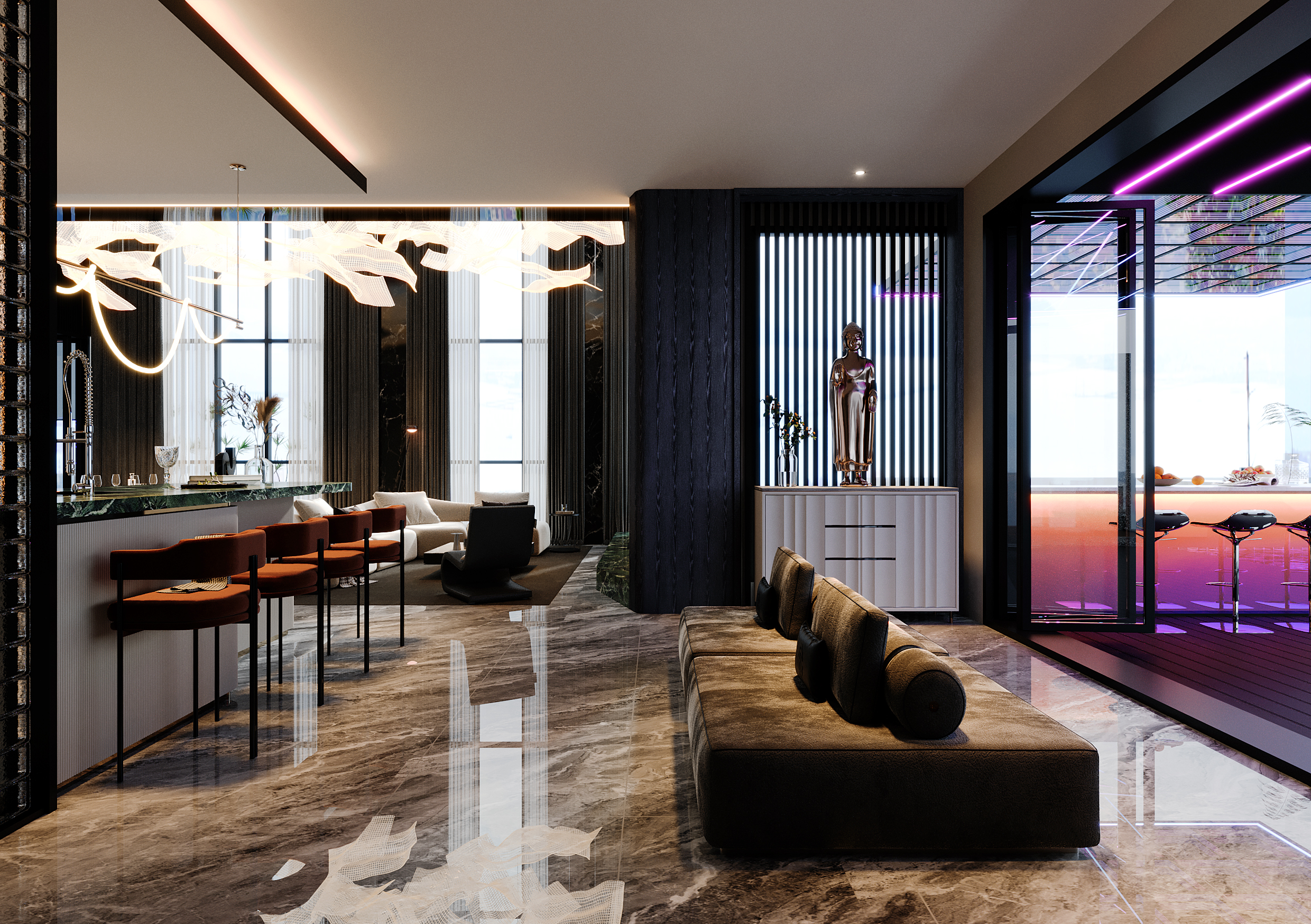 This project embodies modern luxury with a bold contrast of dark tones, warm lighting, and rich textures. The design integrates natural stone, wood, and metallic accents to create an elegant yet comfortable atmosphere. From the double-height living area to the poolside entertainment space, every corner reflects a lifestyle of refinement and ease. The open-plan layout enhances connection between living, dining, and leisure areas, while custom cabinetry and mood lighting bring a sense of tailored sophistication. Private areas such as the bedrooms and walk-in wardrobes are designed for tranquility, balancing functionality with timeless aesthetics. The result is a home that feels both contemporary and deeply personal, defined by contrast, texture, and light.