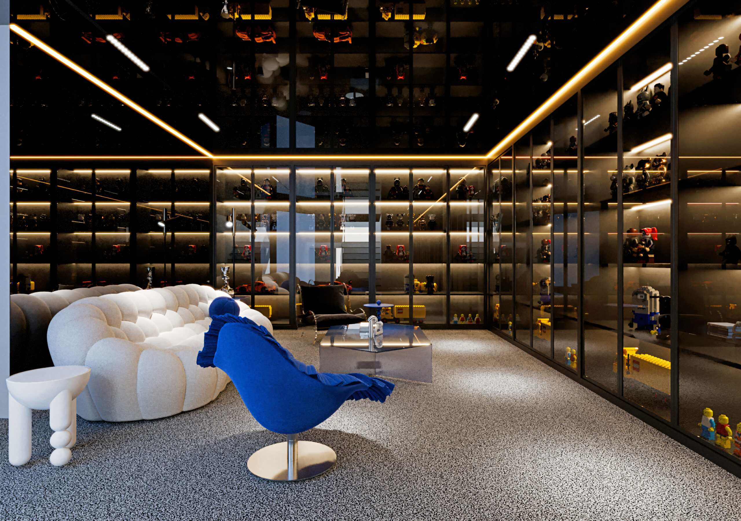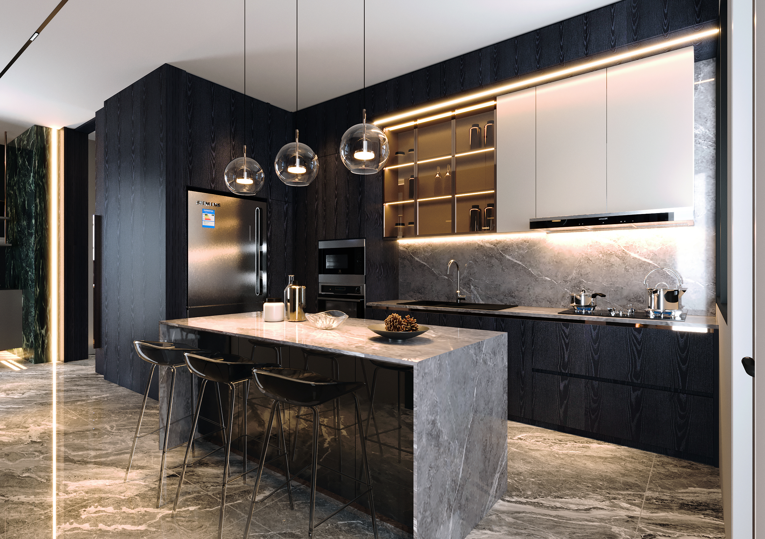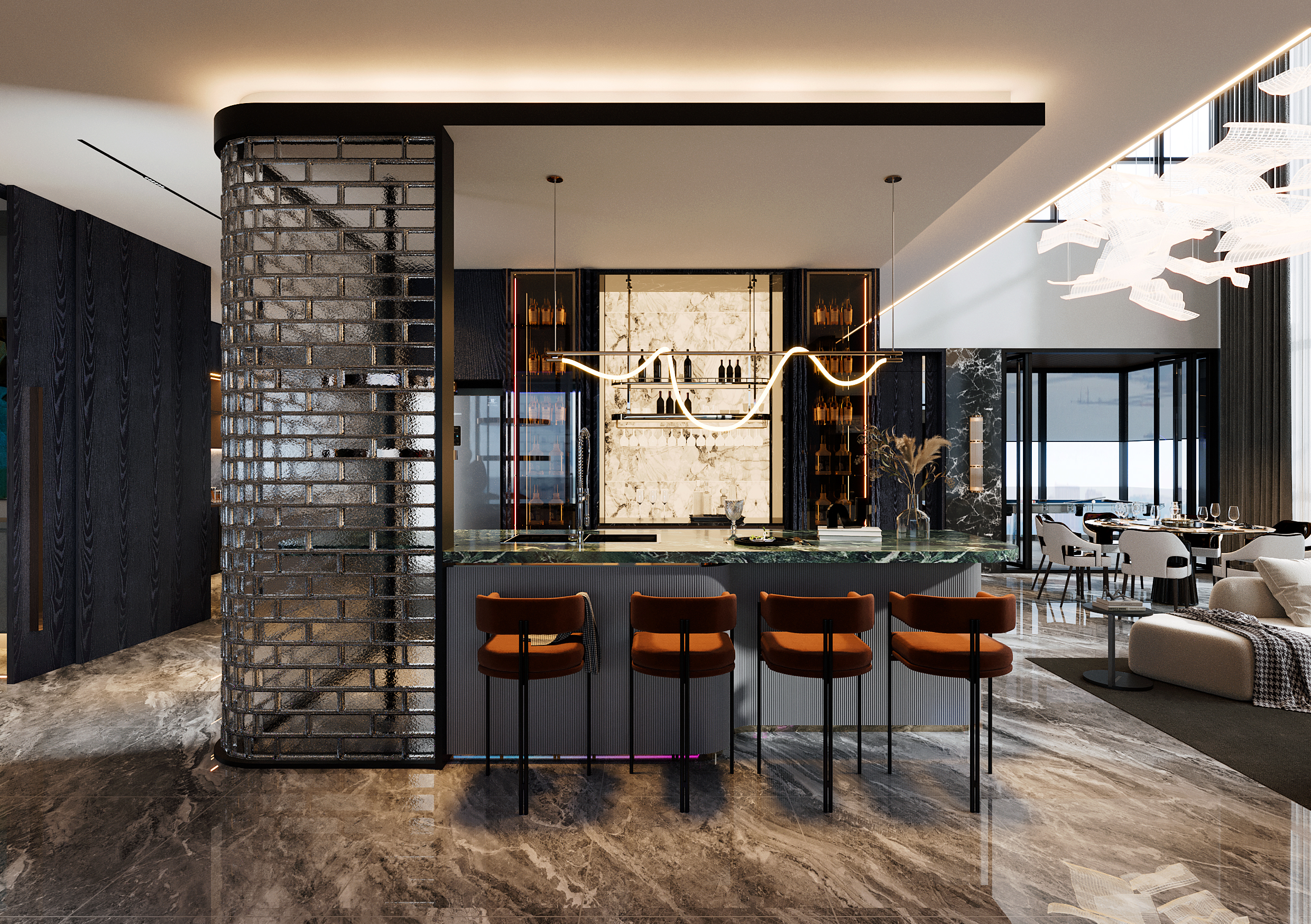 This project embodies modern luxury with a bold contrast of dark tones, warm lighting, and rich textures. The design integrates natural stone, wood, and metallic accents to create an elegant yet comfortable atmosphere. From the double-height living area to the poolside entertainment space, every corner reflects a lifestyle of refinement and ease. The open-plan layout enhances connection between living, dining, and leisure areas, while custom cabinetry and mood lighting bring a sense of tailored sophistication. Private areas such as the bedrooms and walk-in wardrobes are designed for tranquility, balancing functionality with timeless aesthetics. The result is a home that feels both contemporary and deeply personal, defined by contrast, texture, and light.