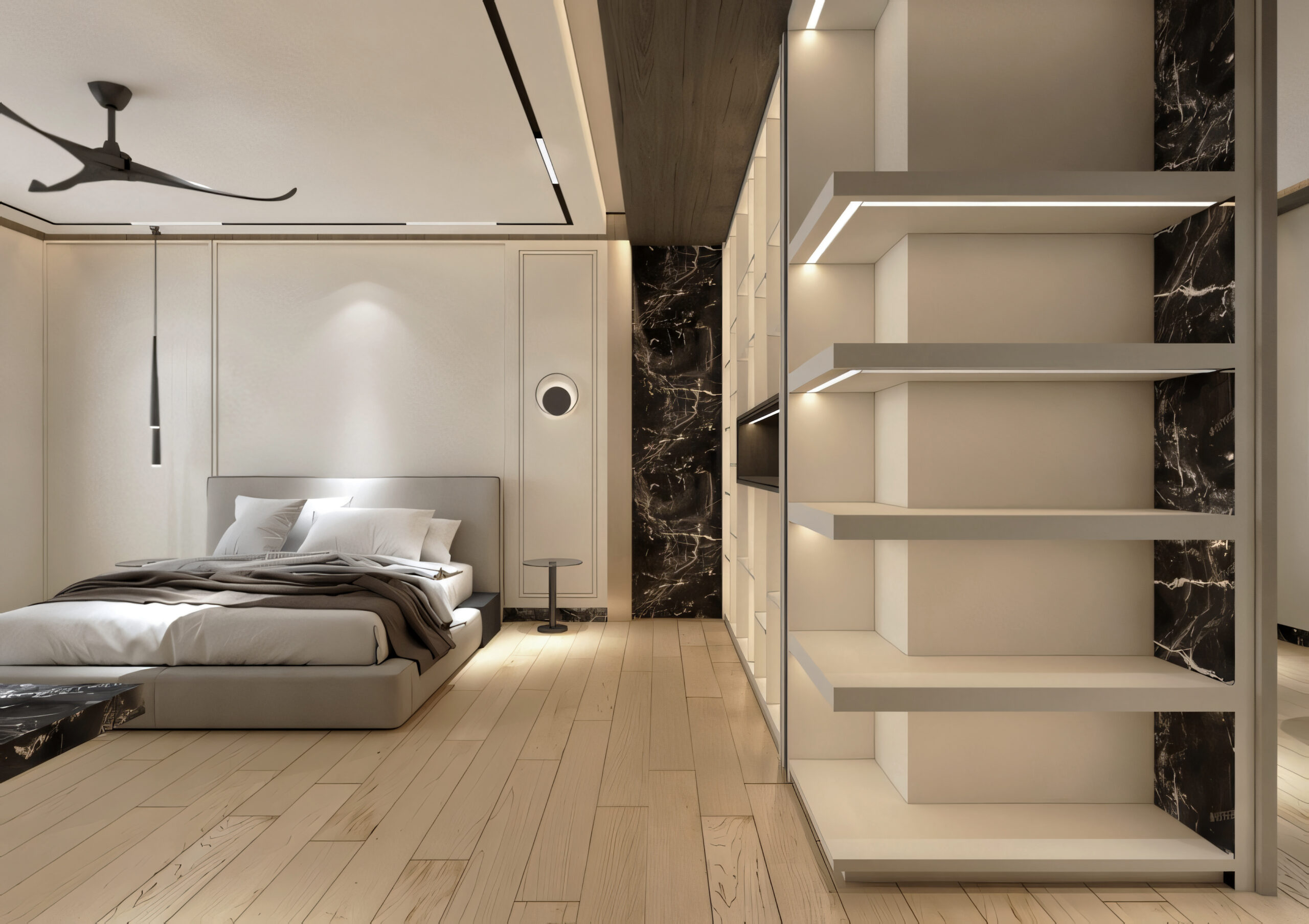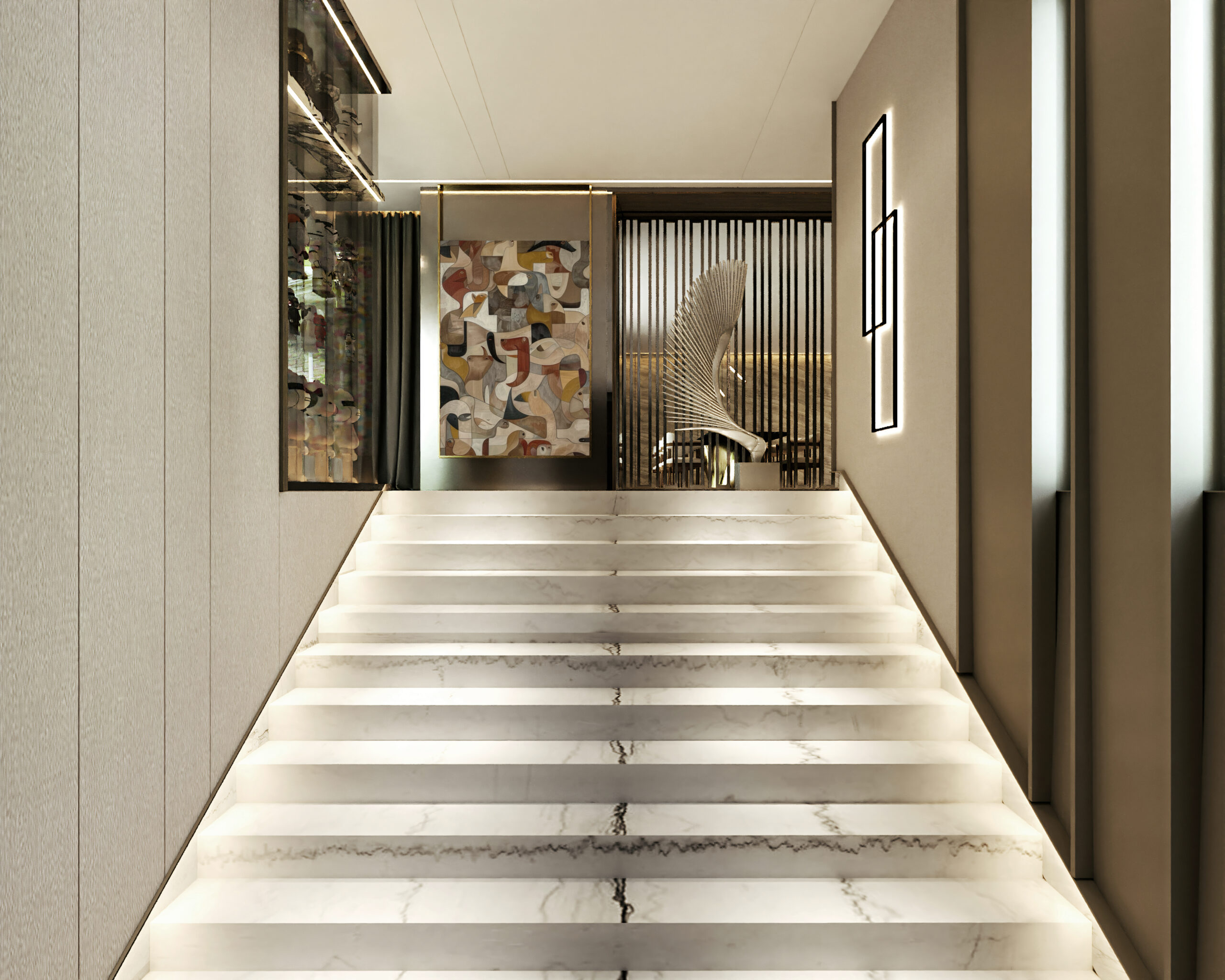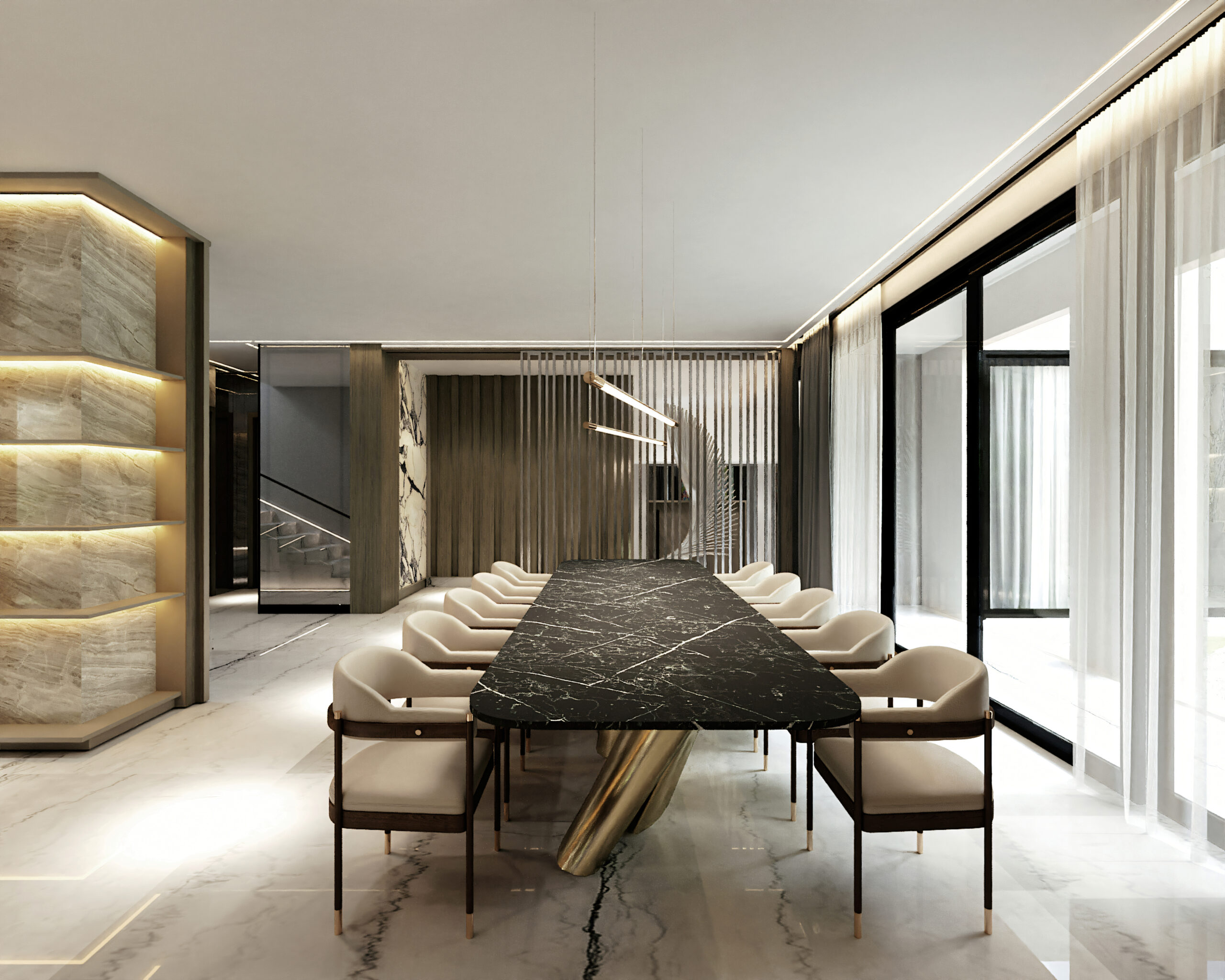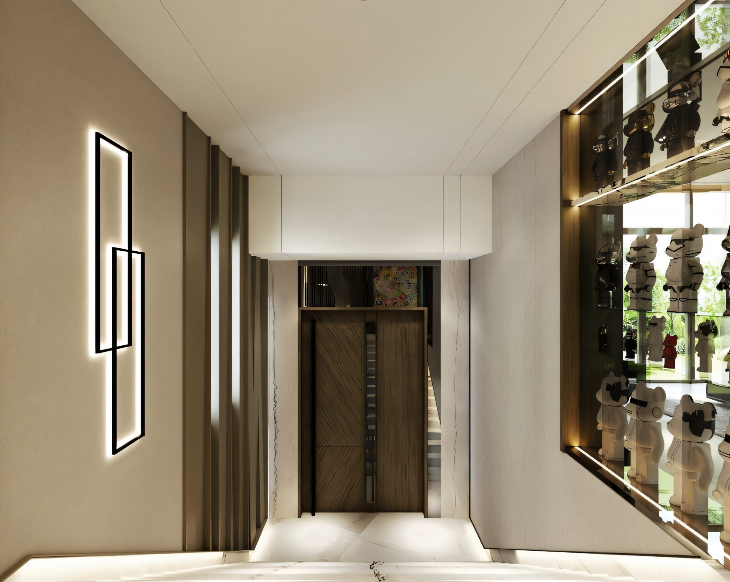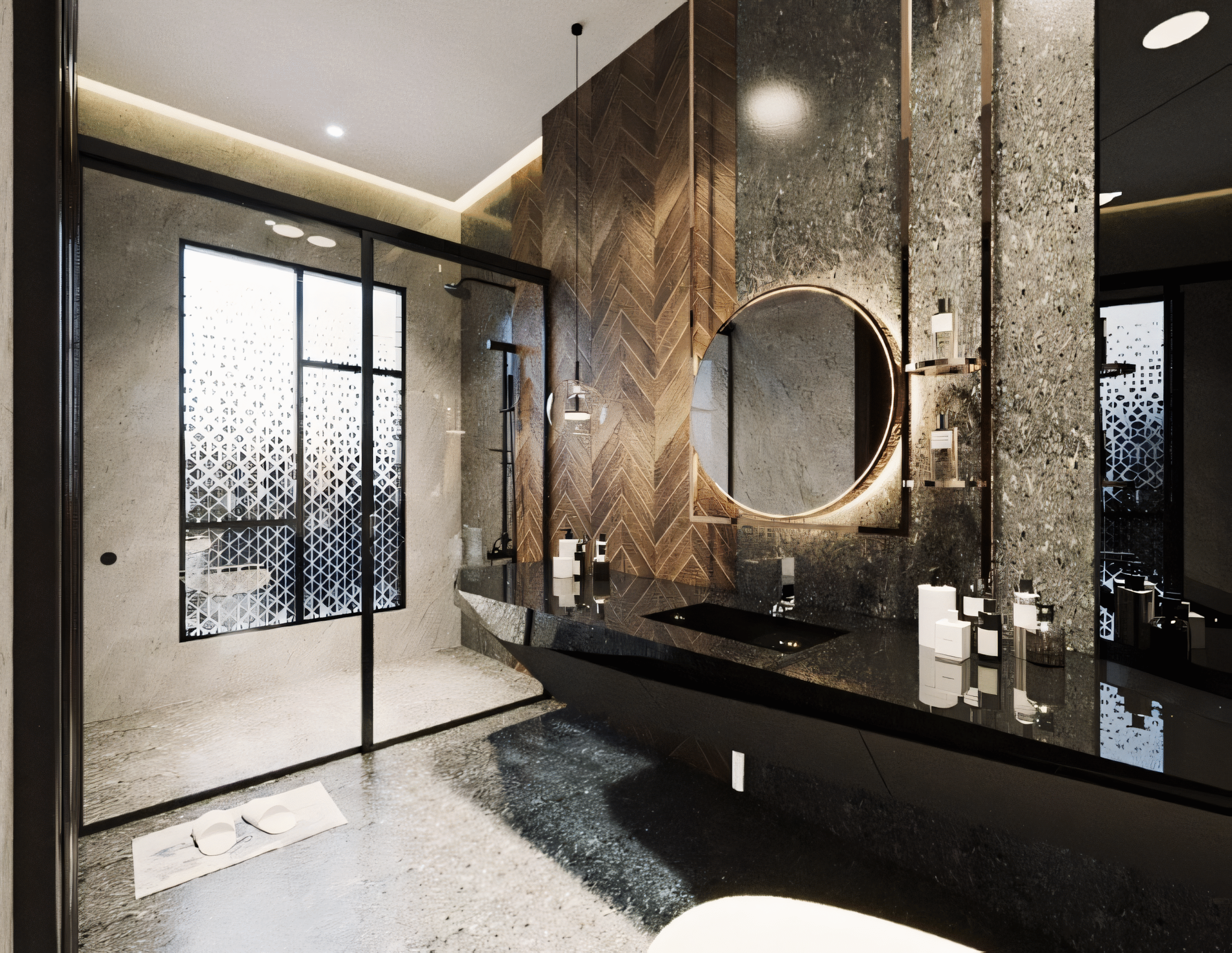He wanted a space that reflected not only who he was—but who he was becoming. A place that spoke in quiet confidence, where strength met stillness, and every shadow had its own kind of beauty. This home, with its bold contrasts and deep, grounding tones, is a reflection of his journey—refined, steady, and full of intent. Dark stone walls catch the golden light that spills from custom pendants, softening the edges of modern lines. Each surface carries a story: the grain of warm oak, the cool touch of marble, the subtle shimmer of brushed metal. The rhythm of light and texture creates a calm intensity—luxurious yet deeply personal. Every room opens to another moment of balance—the open living hall that welcomes laughter, the study that holds his focus, the bedroom that asks for rest. It’s a home built not just for living, but for becoming—a place that reminds him every day: strength can be gentle, and beauty can be quiet.