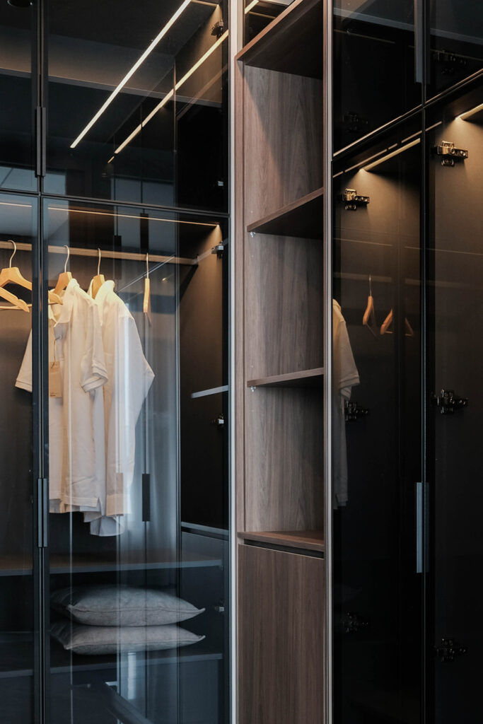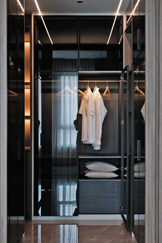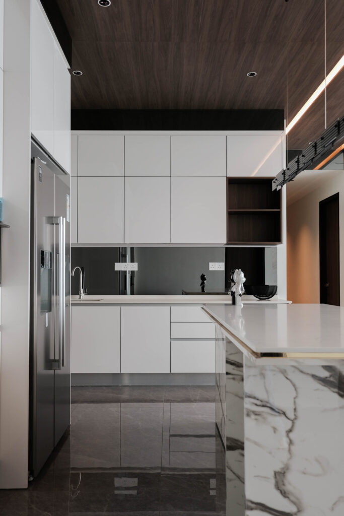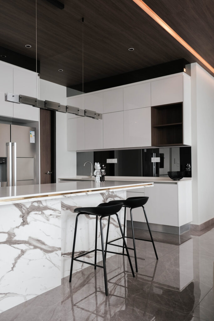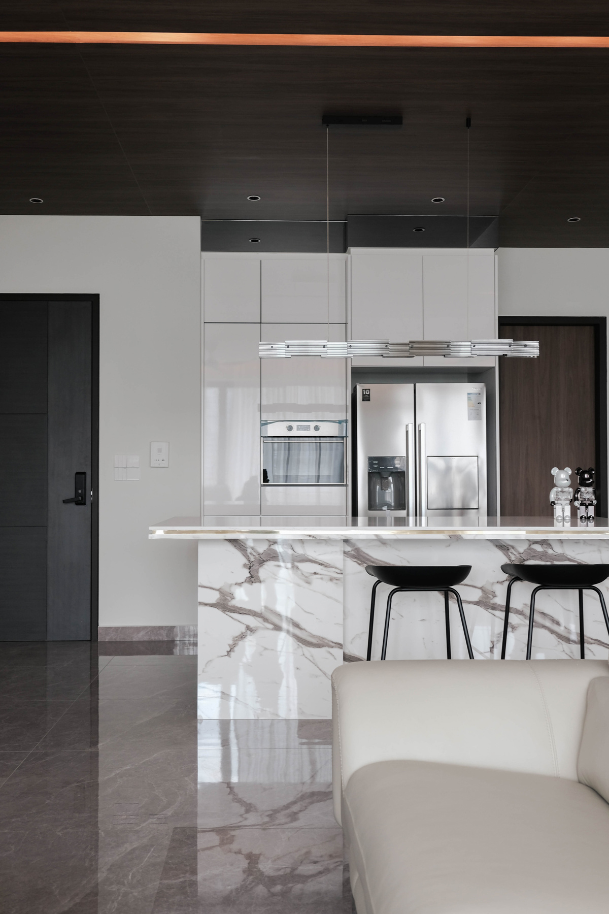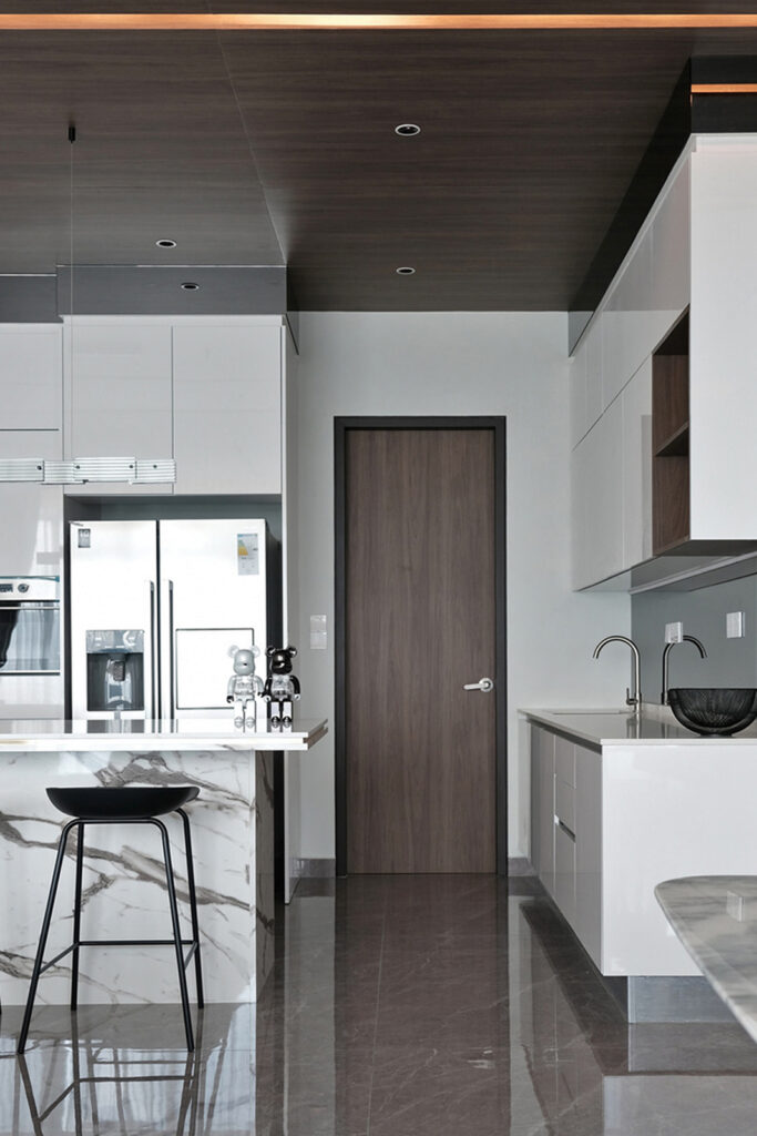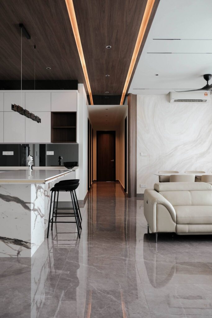 A seamless blend of sophistication and calm, this residence redefines modern luxury through clean geometry, warm textures, and meticulous detailing. The interplay of marble, wood, and muted neutrals creates a timeless atmosphere — elevated by ambient lighting that enhances depth and intimacy. From the sleek open kitchen and refined living area to the tranquil bedroom and glass-enclosed wardrobe, every space embodies quiet elegance and purposeful design. Natural light flows effortlessly through each room, accentuating the refined materials and subtle contrasts that bring the interiors to life.